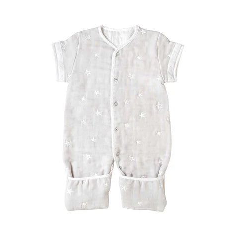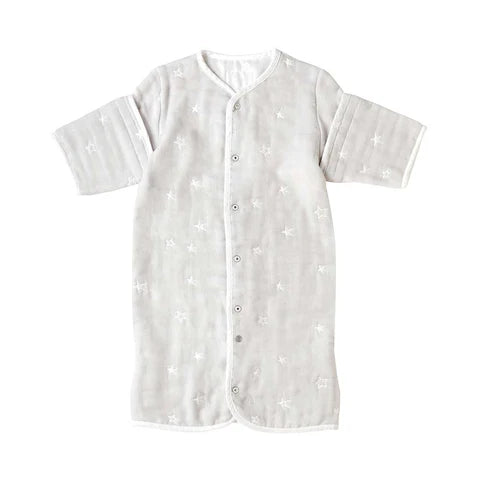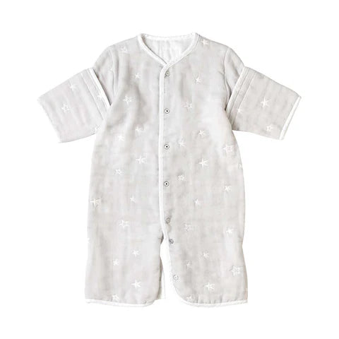 The bottom can be arranged in three styles using snap buttons — as a coverall, foot muff, or gown. The divided leg design prevents the fabric from riding up while sleeping, offering extra comfort and security.