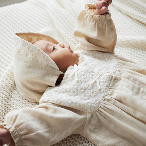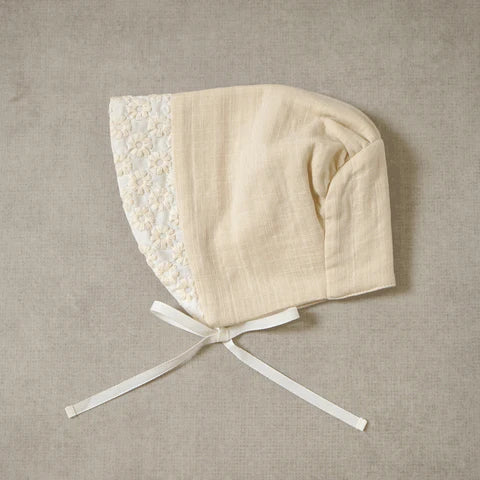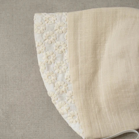 Matching Bonnet in double gauze with a floral embroidered brim that softens beautifully with every wash.