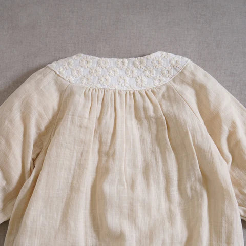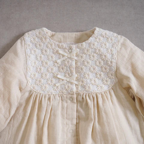 Elegant 2-Way Gown in soft double gauze with floral embroidery and ribbon accents.