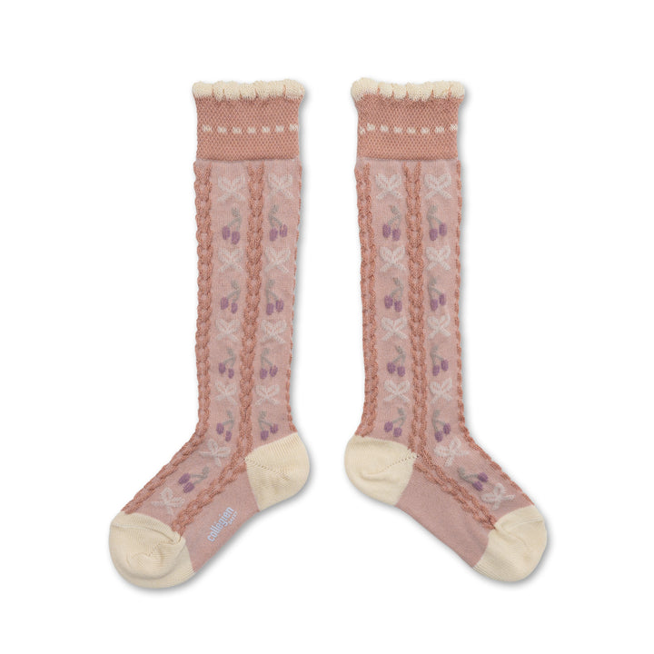Cerise - Jacquard Cherries and Bows Knee-high Socks - Vieux Rose