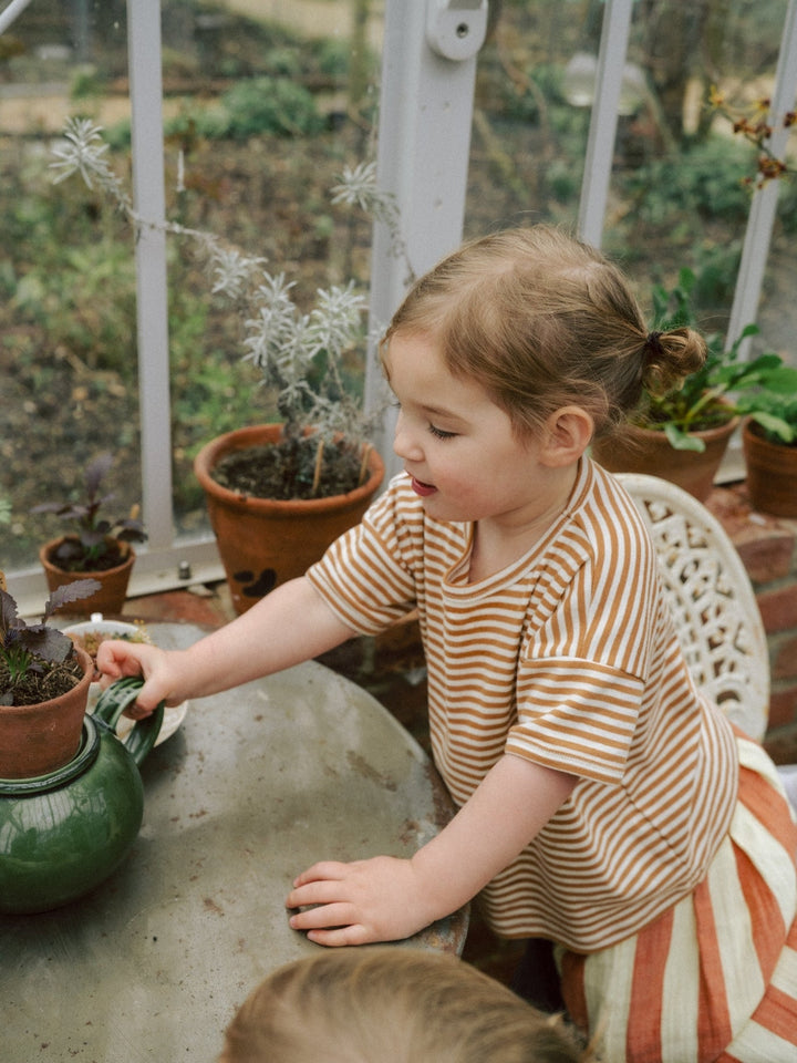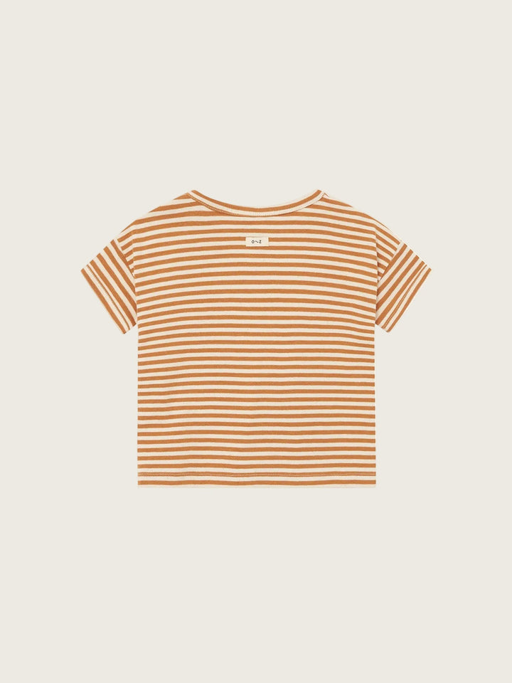 Crafted from beautifully soft organic jersey cotton, it feels light and breathable against delicate skin. The warm copper stripes bring a cheerful yet timeless touch, brightening everyday outfits while pairing effortlessly with the rest of the collection. A comfortable, versatile staple made for carefree summer days.