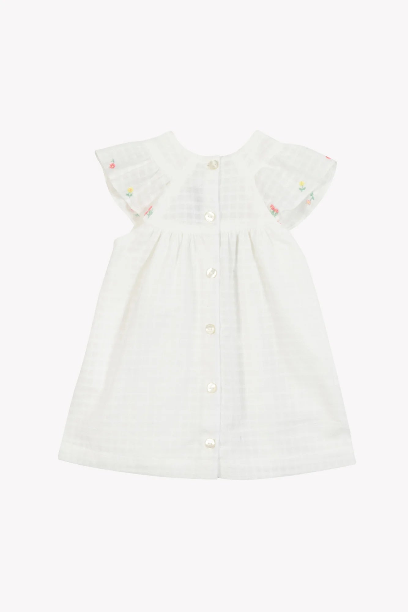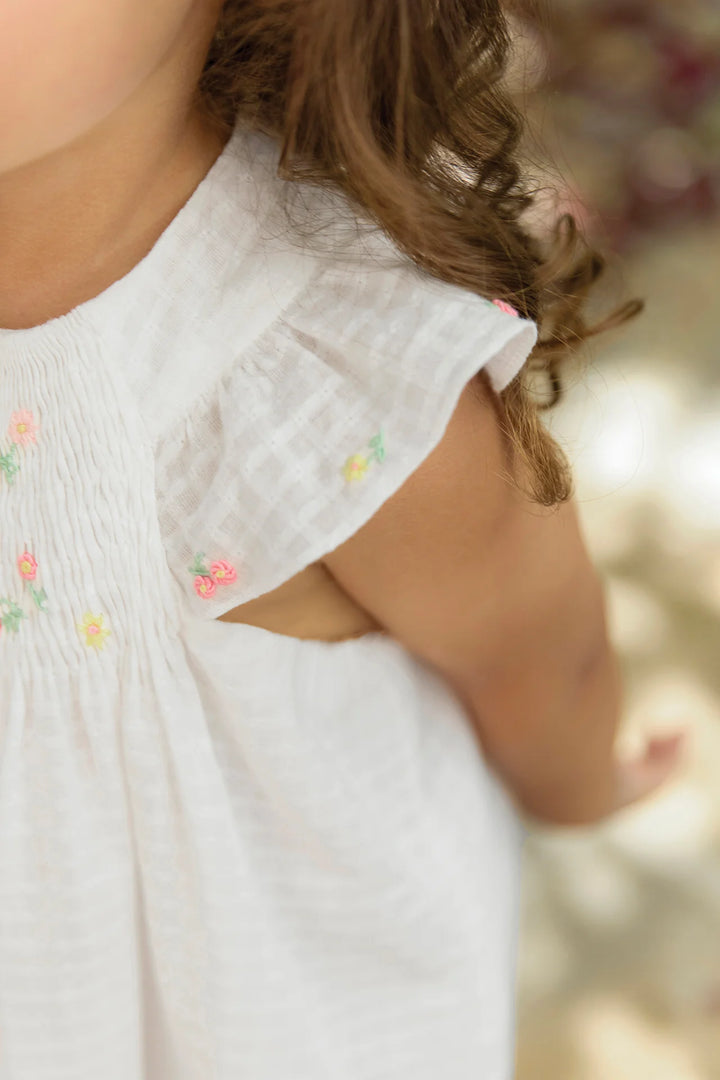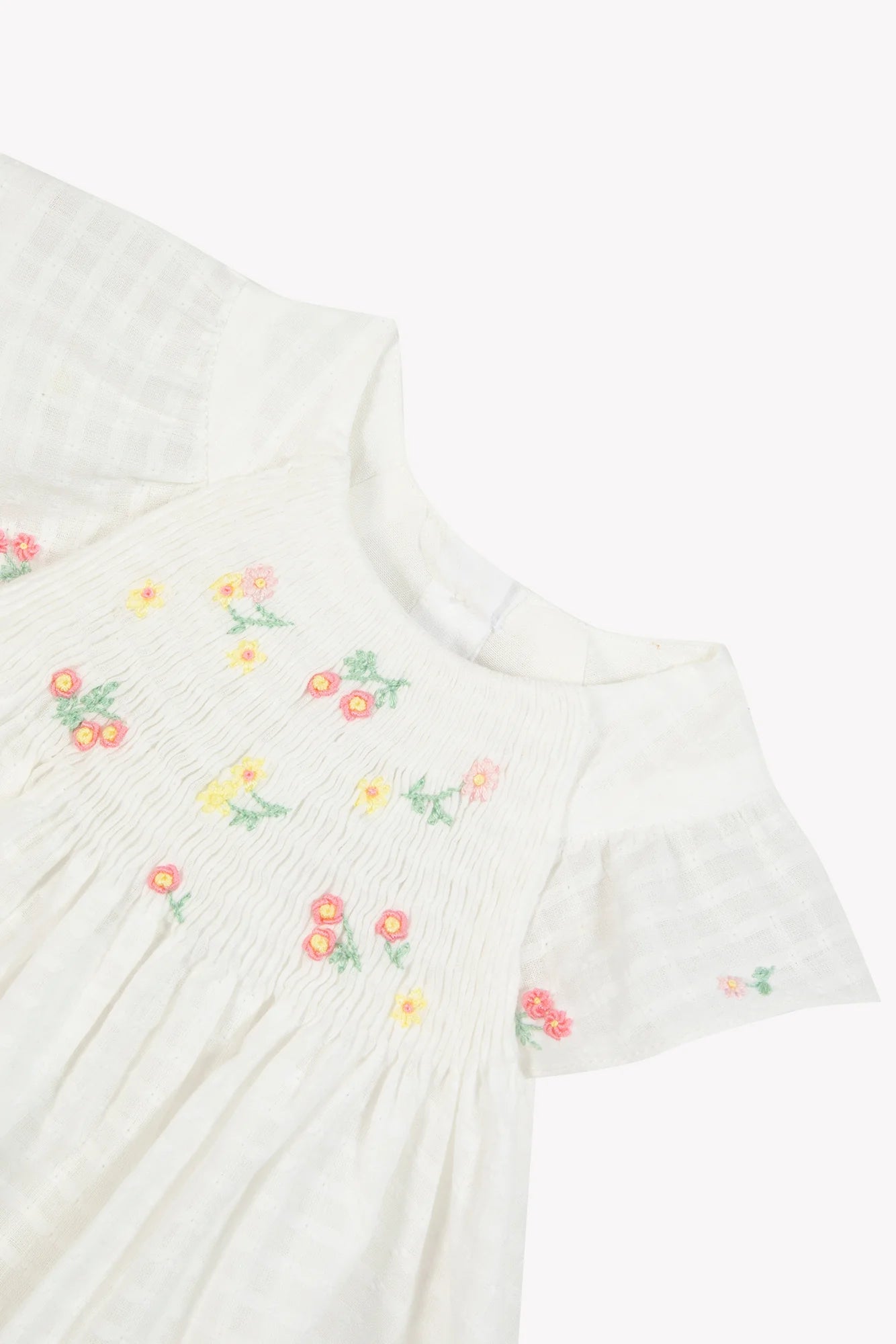 This Dress white is a real enchantment with its hand floral embroidery and its shaped veil. Perfect for a little one in a "fantastic baby garden", it offers refined elegance with its smock details and Buttons in the back. Ideal for special occasions, it combines comfort and style, in 100% cotton.
