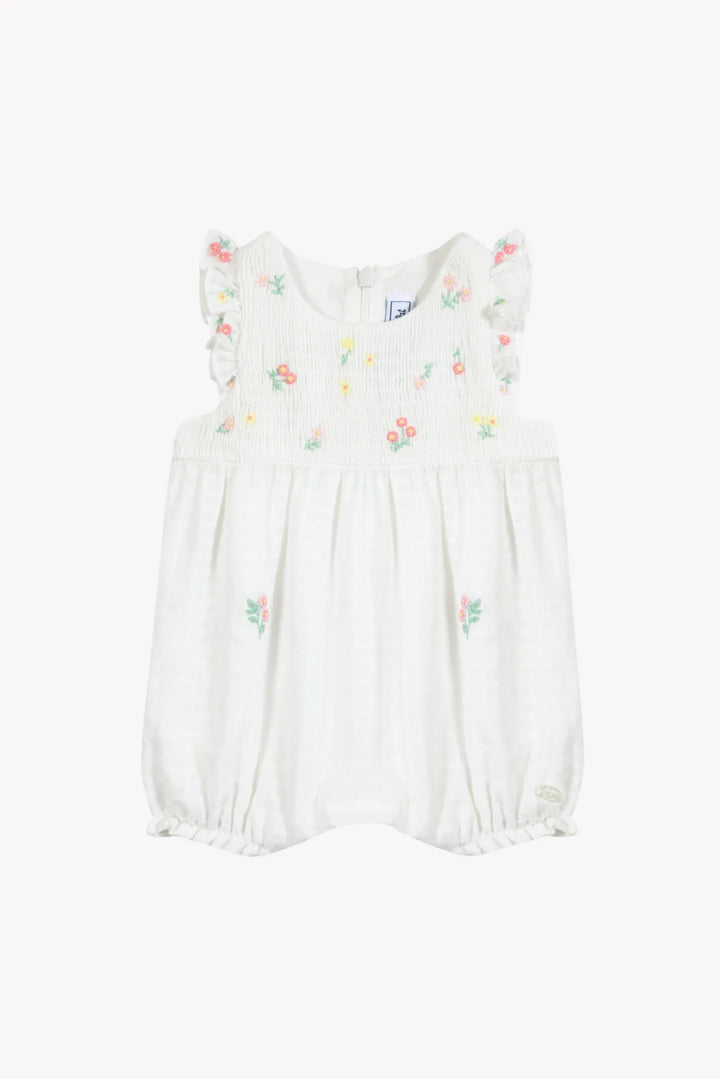 This Jumpsuit short white dress from the “Baby fantastic garden” collection is a delightful choice for your little princess! With its handmade floral embroidery, its Ruffles delicate and its smock detail, it combines elegance and comfort. Practical with sound Zip fastening in the back and Buttons snaps at the crotch, it is ideal for summer days. In 100% cotton, it guarantees softness and lightness.
