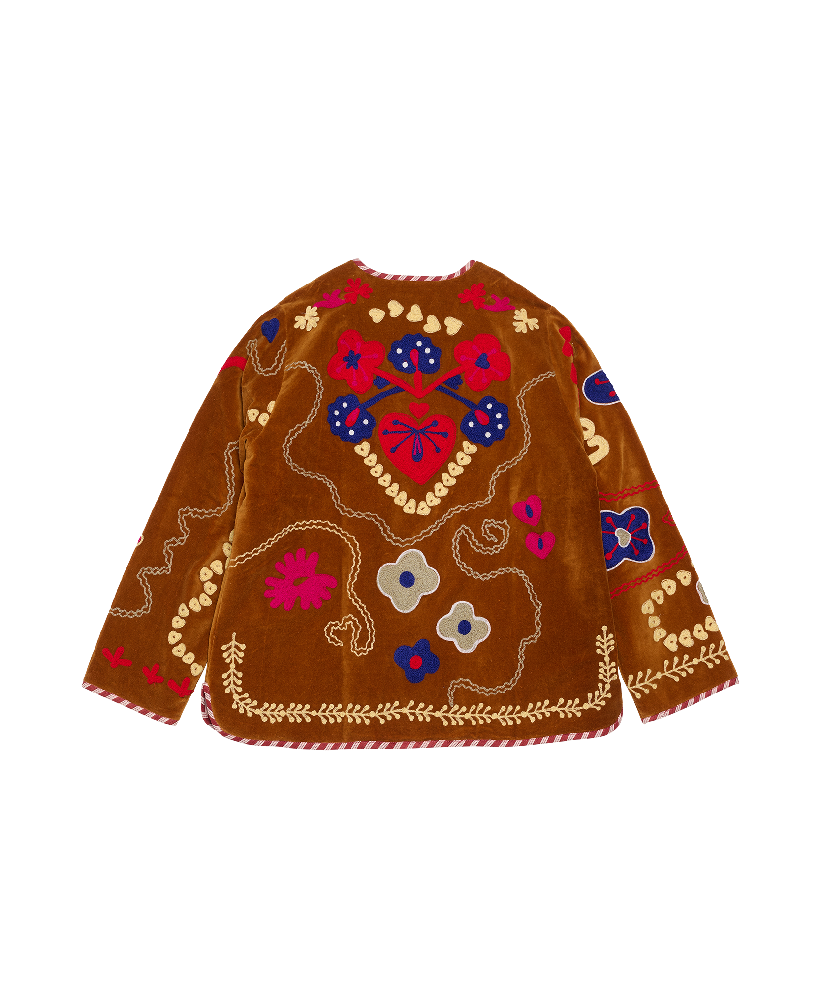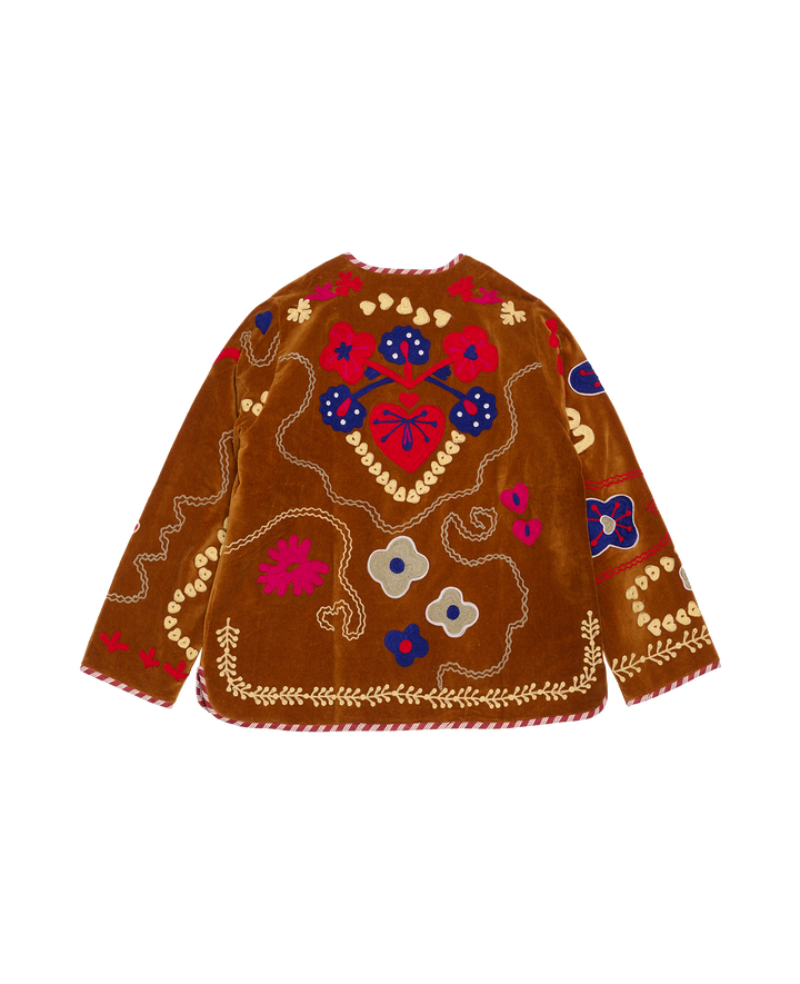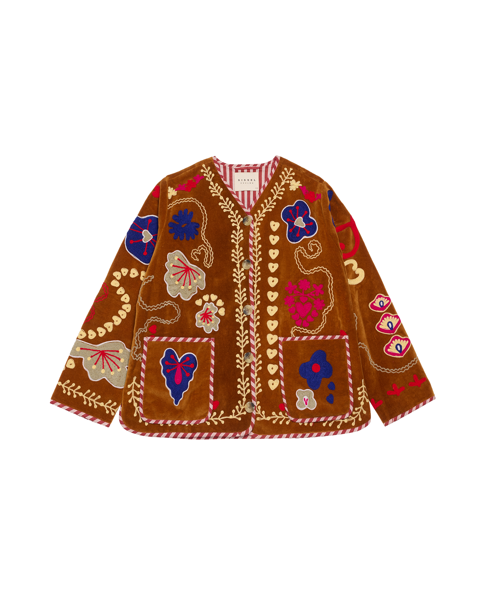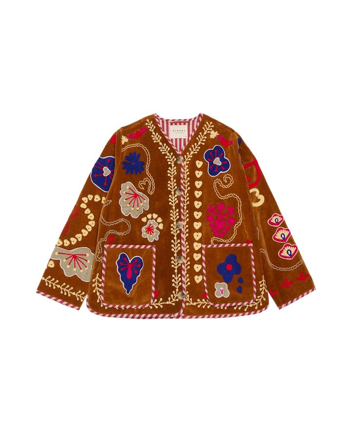 Maggie MINI Jacket is made in cotton canvas and features eye-catching all over Suzani floral embroidery. It has a casual fit, two pockets at the front and has buttons in front placket. The special designed artwork features poppy flowers, strawberries, evil eyes and other cute motifs.