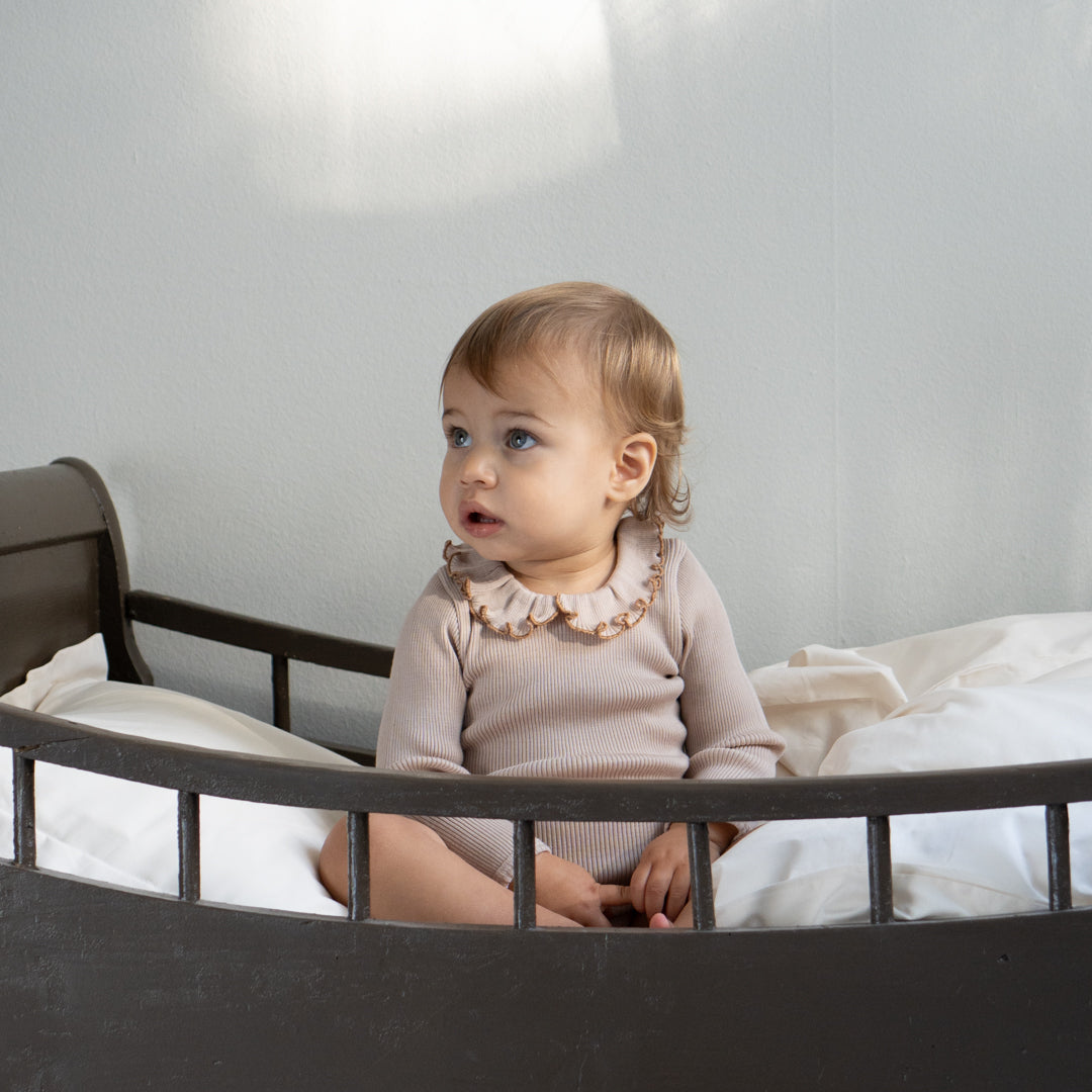 Our adorable Athena body features a ruffled Peter-Pan collar that frames your baby’s face in a cute and sophisticated way. The neck opens in the back with a flat shell-button. For a playful and distinctive touch, we've adorned this style with contrast stitches around the neck-opening and shell-hem on the cuffs, setting it apart as a truly unique piece in your baby's collection.