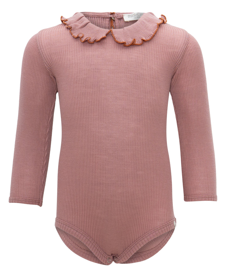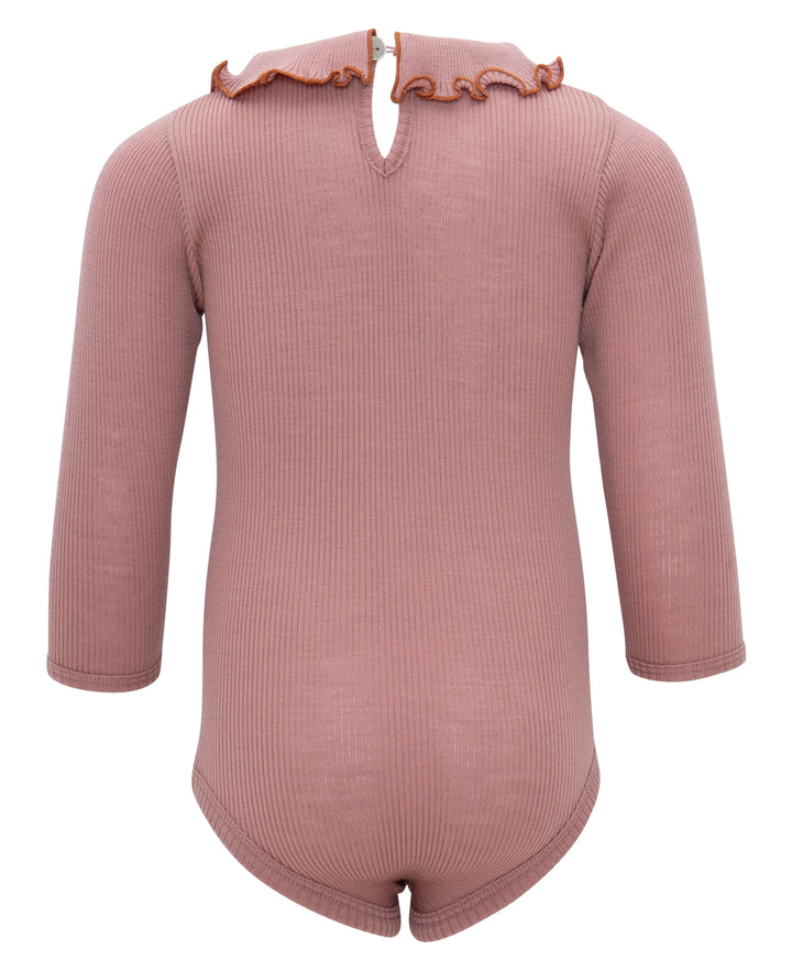 Our adorable Athena body features a ruffled Peter-Pan collar that frames your baby’s face in a cute and sophisticated way. The neck opens in the back with a flat shell-button. For a playful and distinctive touch, we've adorned this style with contrast stitches around the neck-opening and shell-hem on the cuffs, setting it apart as a truly unique piece in your baby's collection.