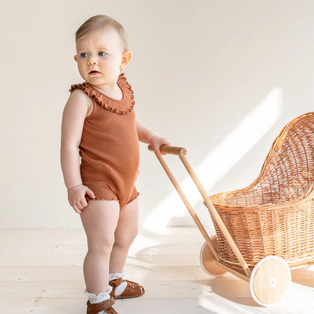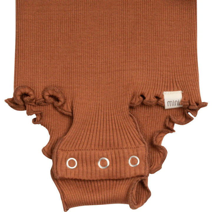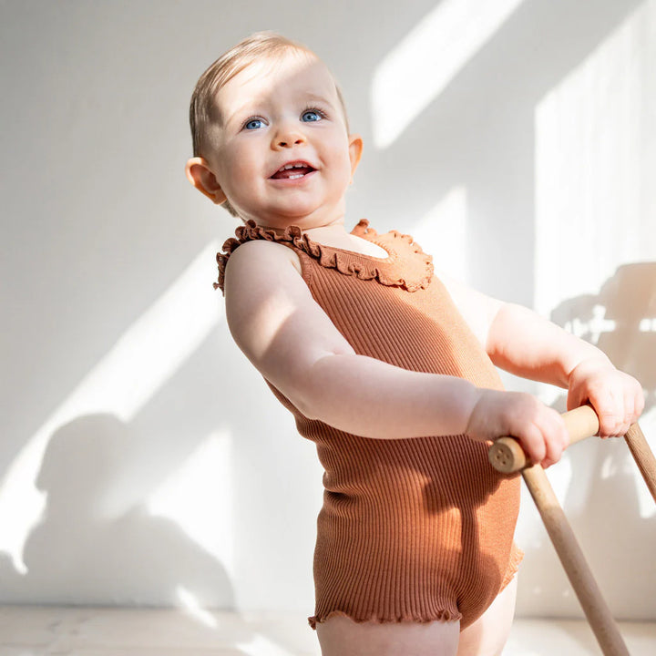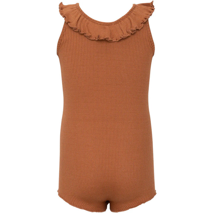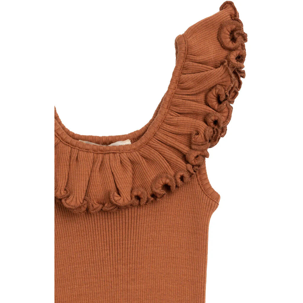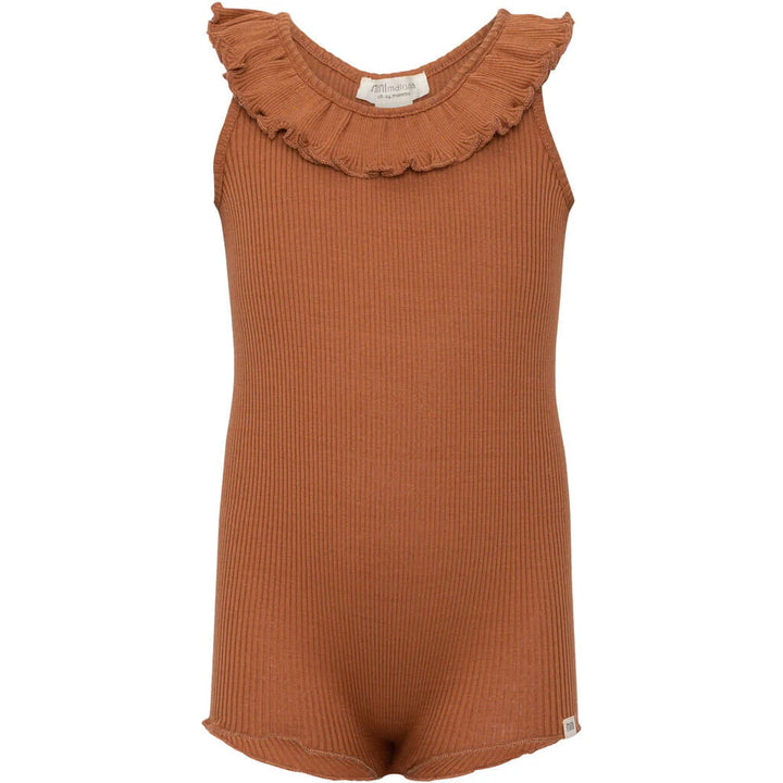 Sleeveless round-neck body made in stretchy, soft seamless silk. Highly flexible with a body-hugging fit. With frills around the neckline and legs.