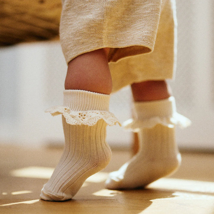 Children's cotton socks from MPkids. The socks feature a wide rib structure and an elastic fold-over cuff, finished with a delicate lace trim.