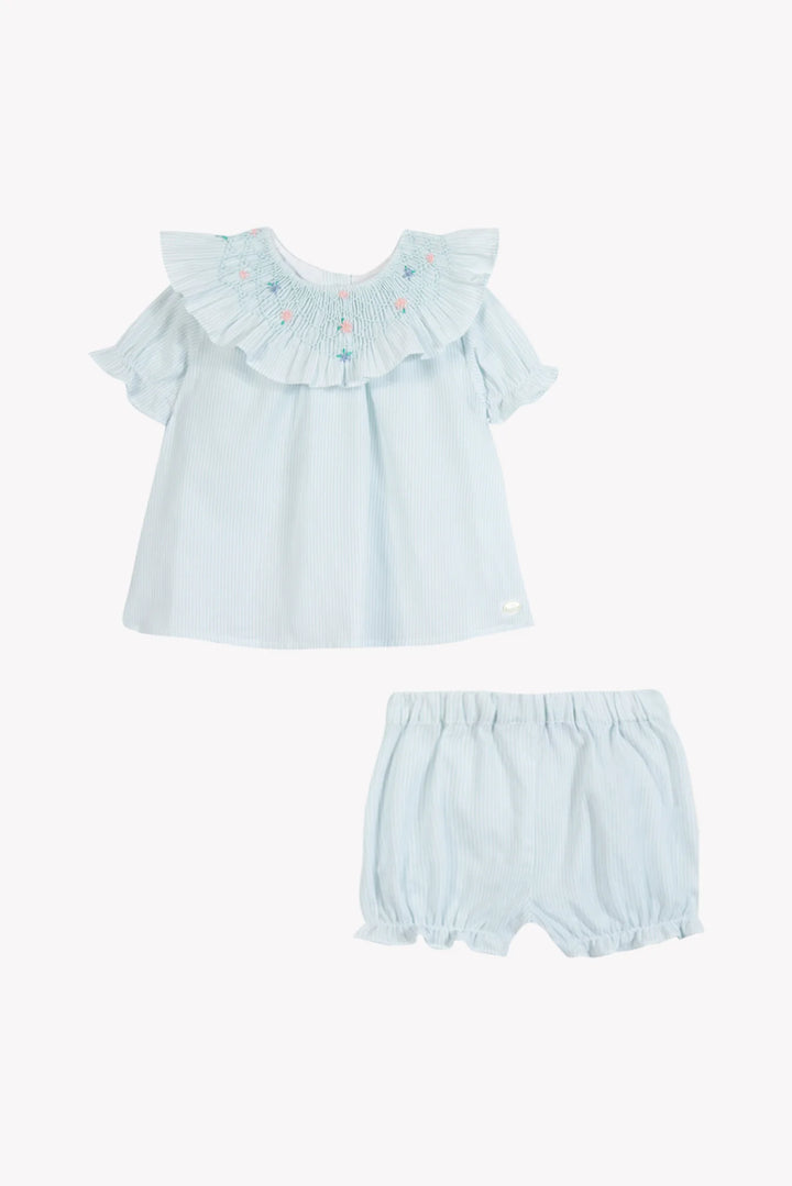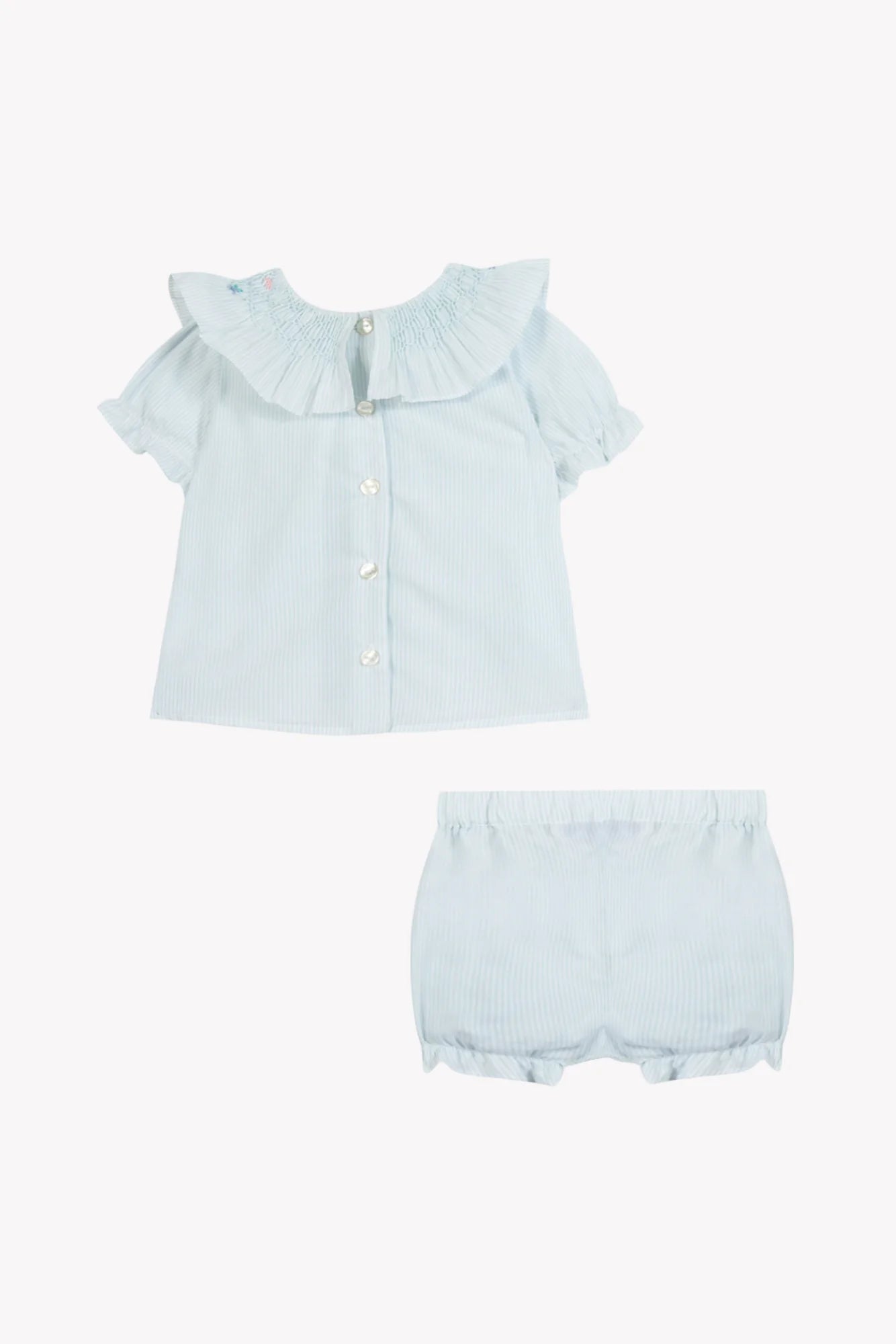 This Outfit short opaline Stripes is a perfect choice for little girls who like to play elegantly! With his Ruffled collar adorned with Smocks and handmade embroidery, it brings a touch of originality. The Short Elastic and short sleeves provide optimal comfort for sunny days. Perfect for the “baby country club” theme, this garment is made of 100% cotton.