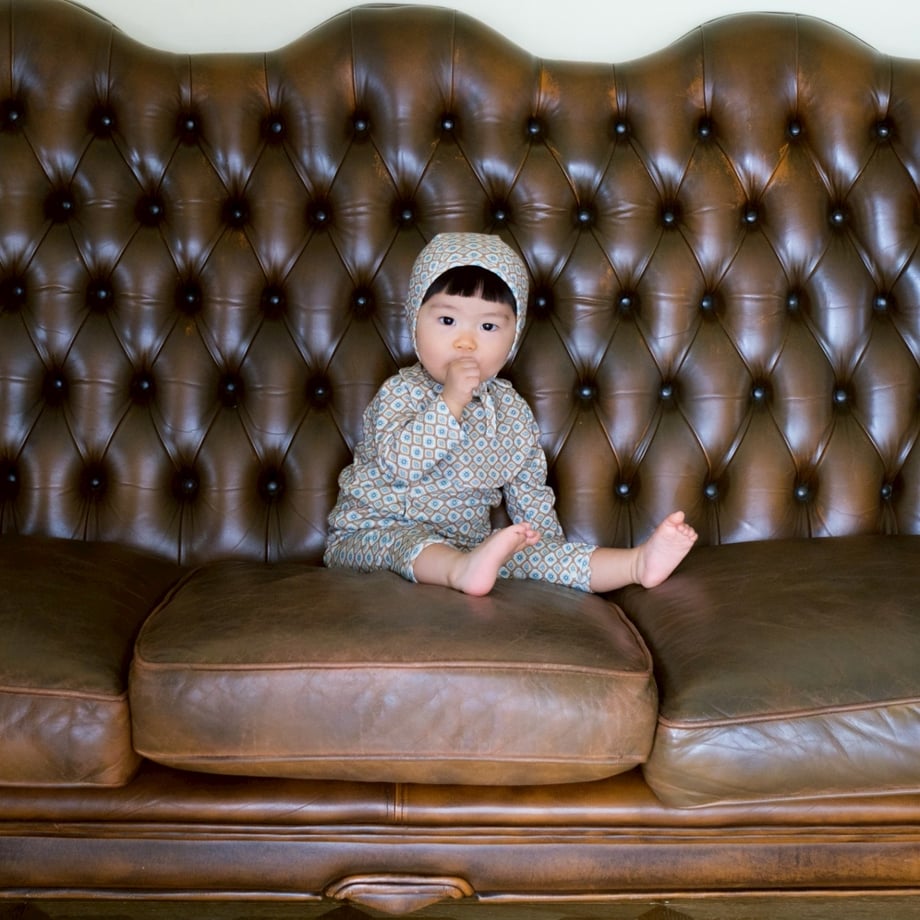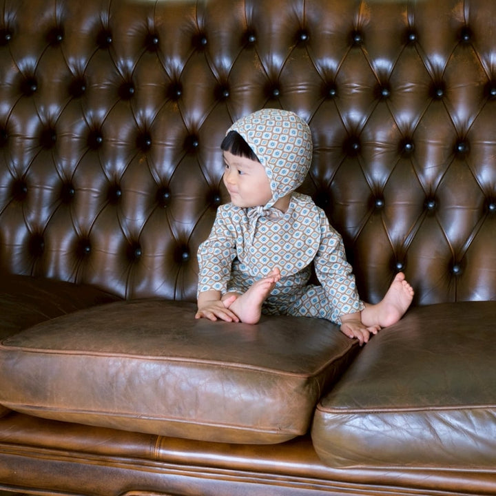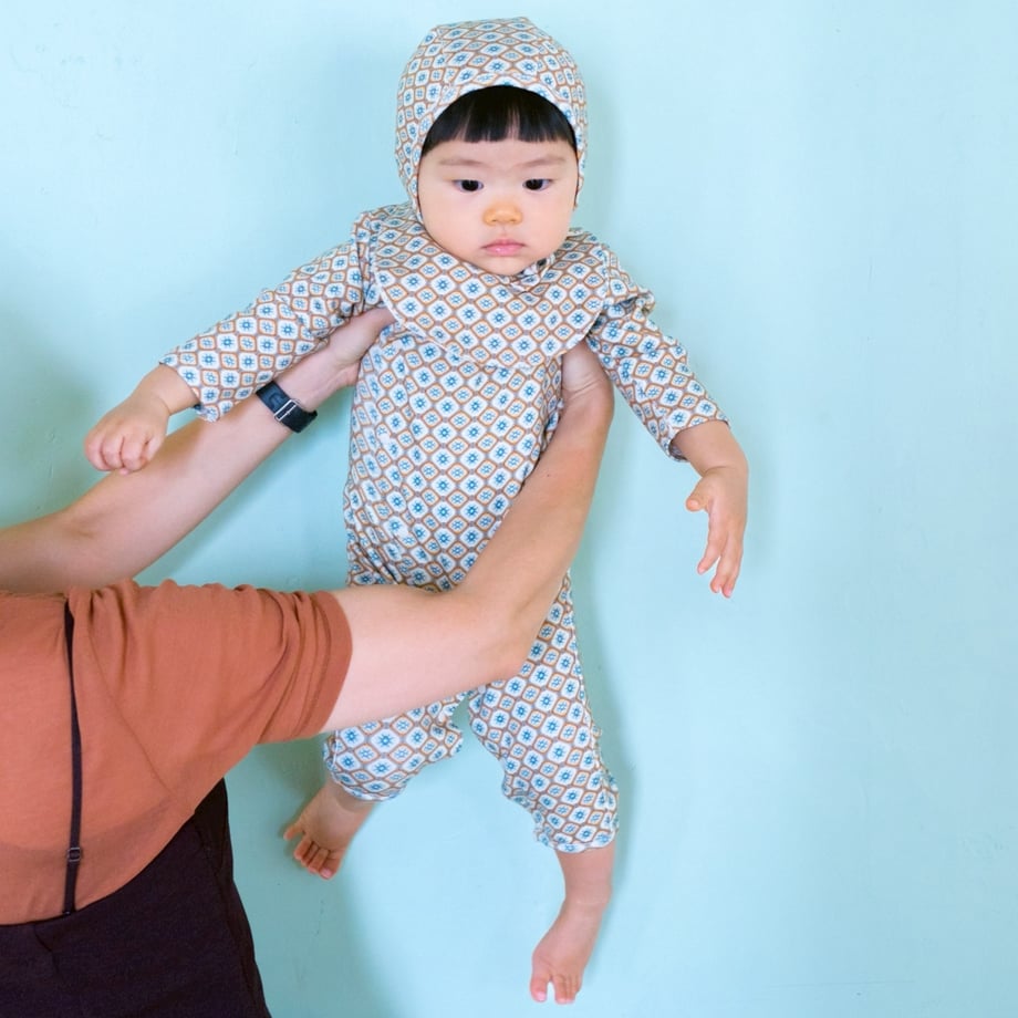 The baby bonnet with a retro-cute pixel art print 🎨👶 There are also a matching romper and bib in the same series!! Perfect as a newborn or baby shower gift 💝