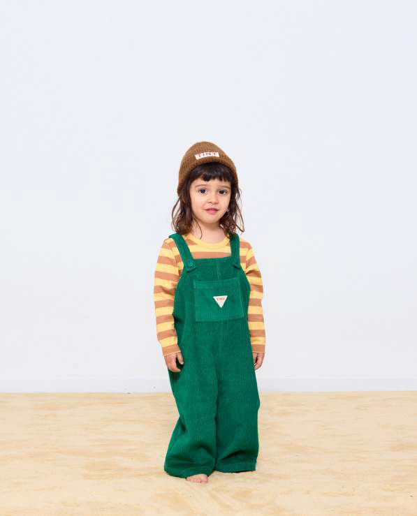 These colid-colored dungarees are made from 100% cotton soft corduroy fabric and offer a relaxed, comfortable fit. They feature a simple, easy-to-wear cut with buttoned straps, front pocket and a snap-button opening at the bottom for quick diaper changes. Perfect for layering over a tee or wearing on their own, these dungarees add a touch of personality to any casual look.