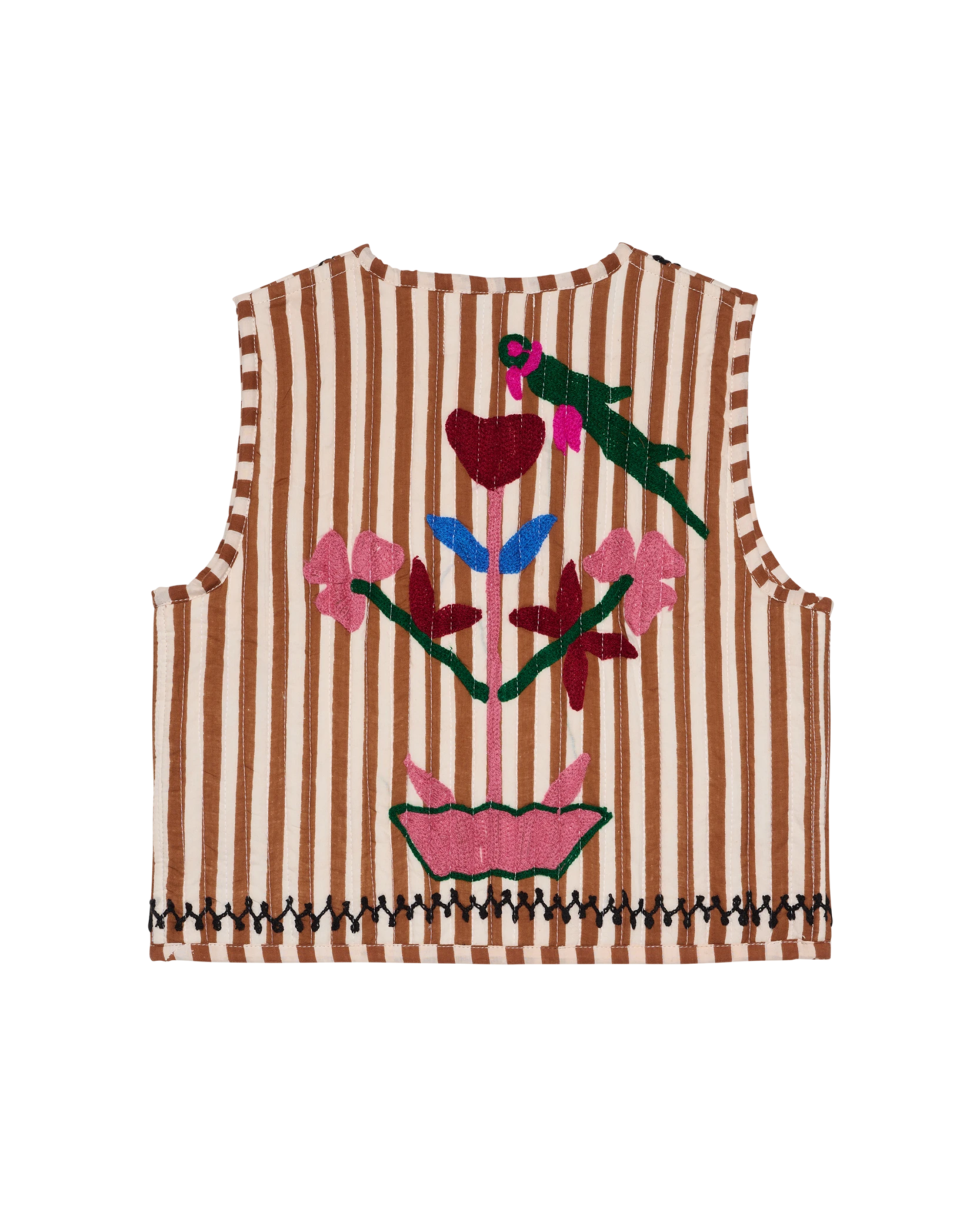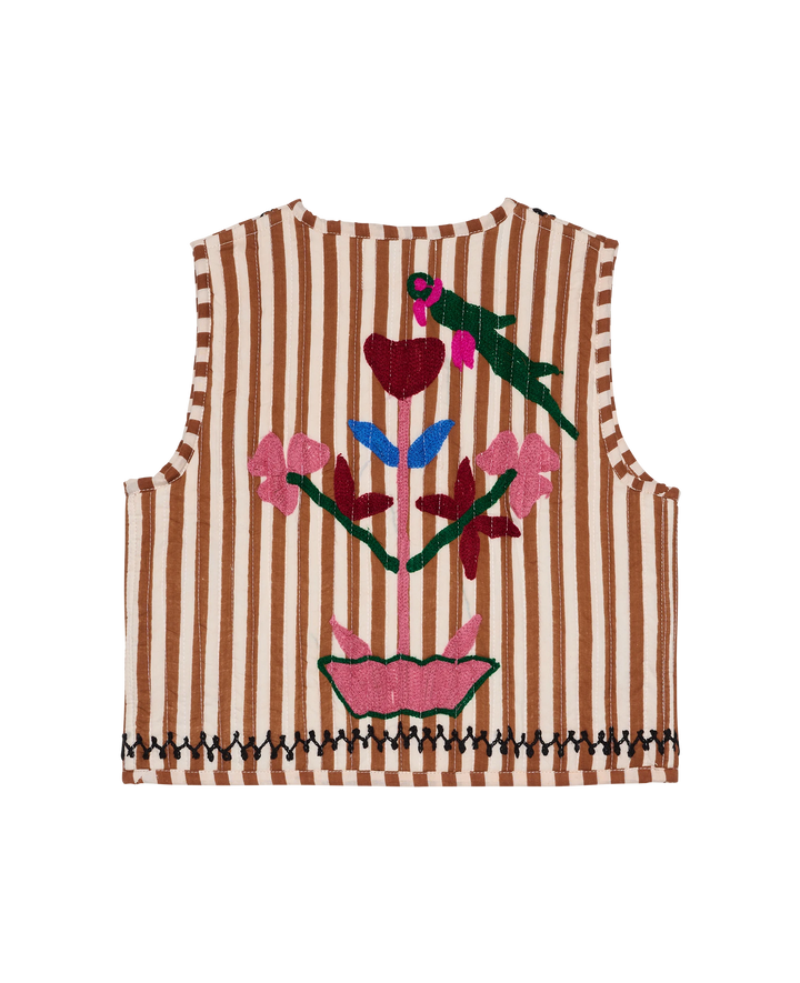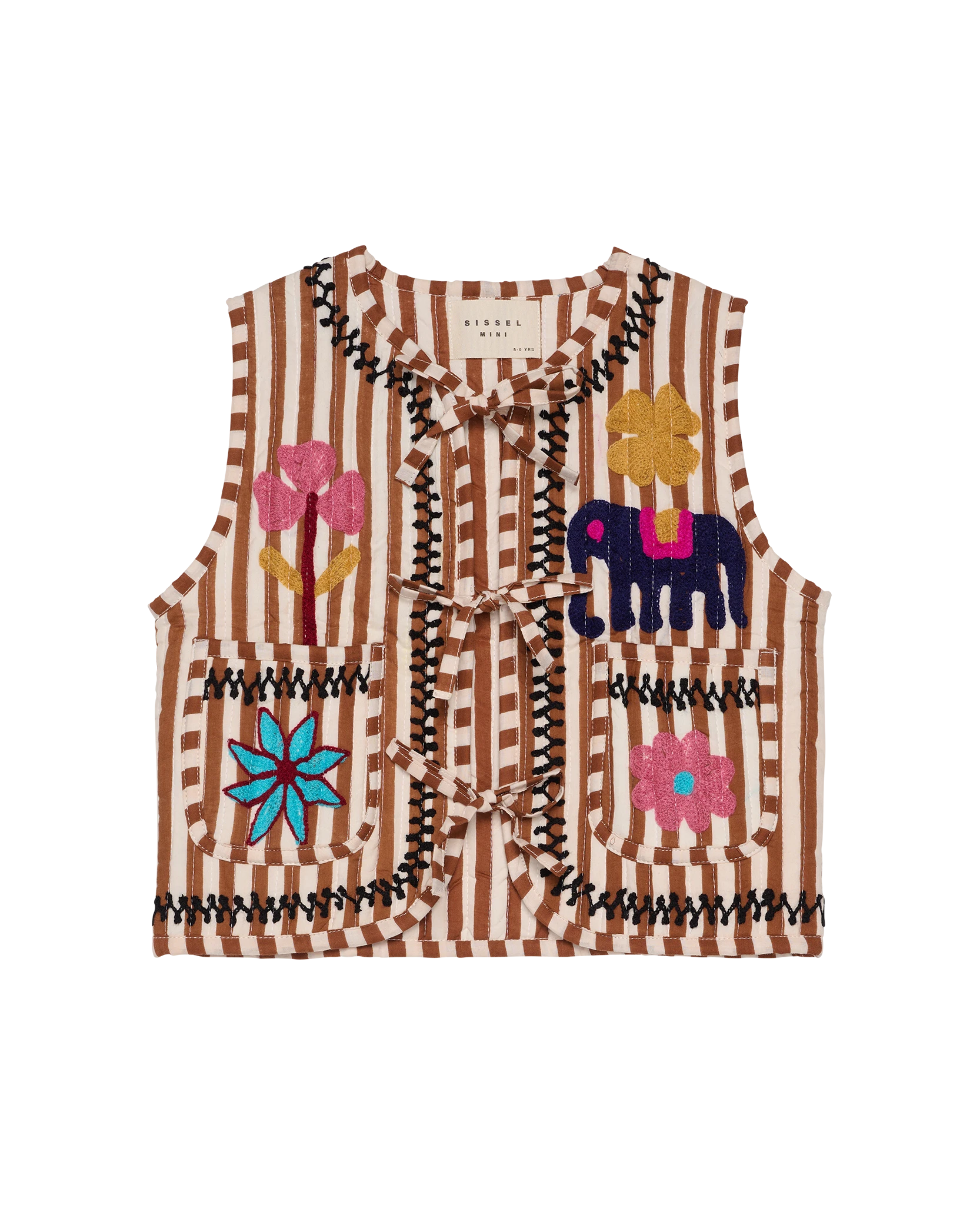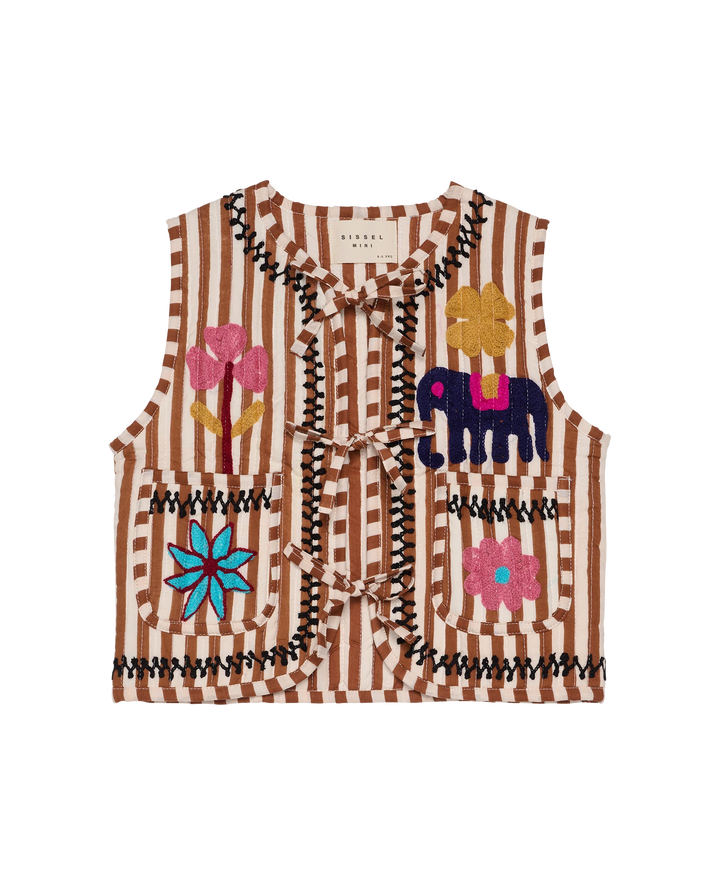Vilja MINI Vest is a cute vest made in 100% organic cotton printed with stripes. It is padded and quilted in a line pattern. The vest is decorated with suzani embroidery featuring bold and playful motifs like an elephant and flowers. The vest can be closed with three sets of bows and has two pockets at the front. All edges are finished with matching cotton tape, and the vest is fully lined.